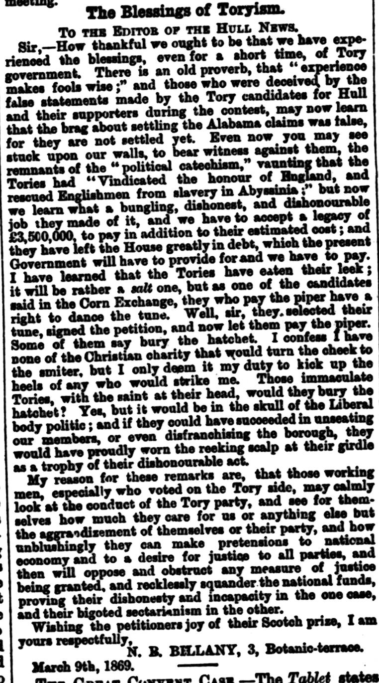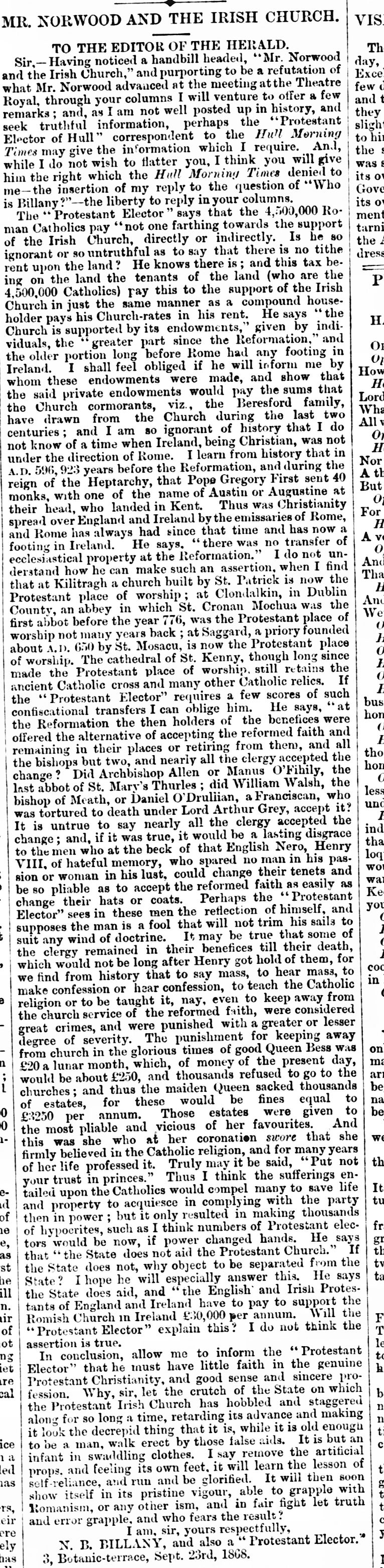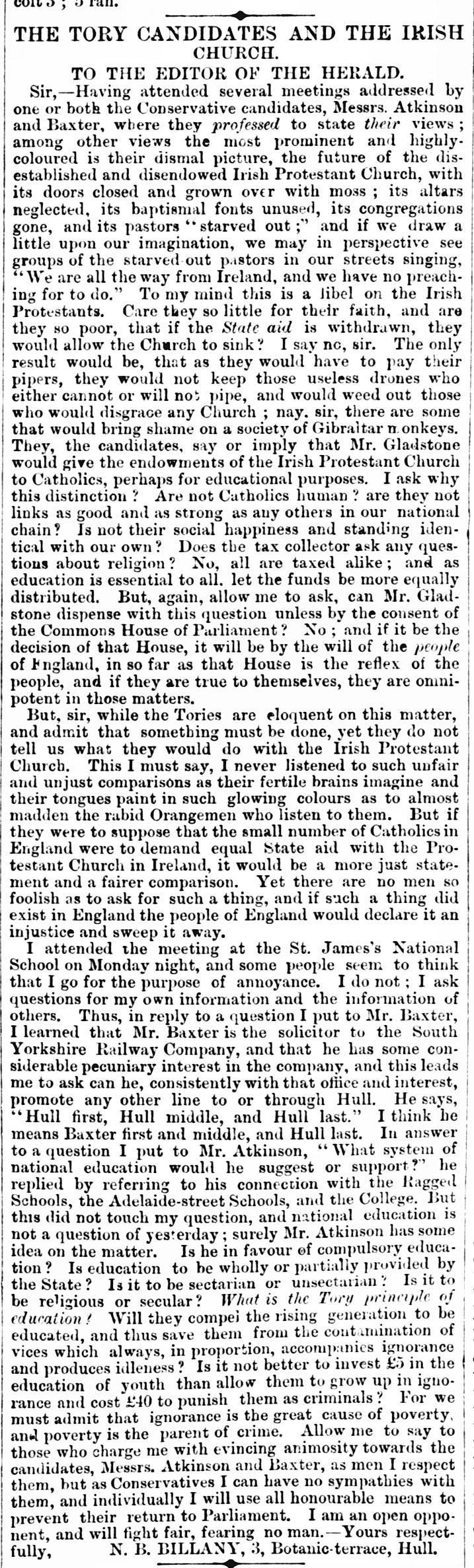 The Tory Candidate and the Irish Church, a Letter To The Editor