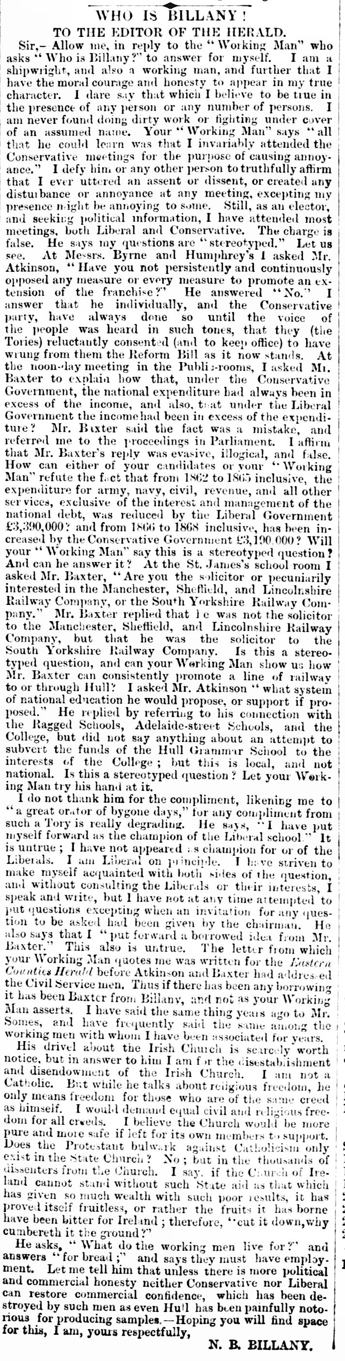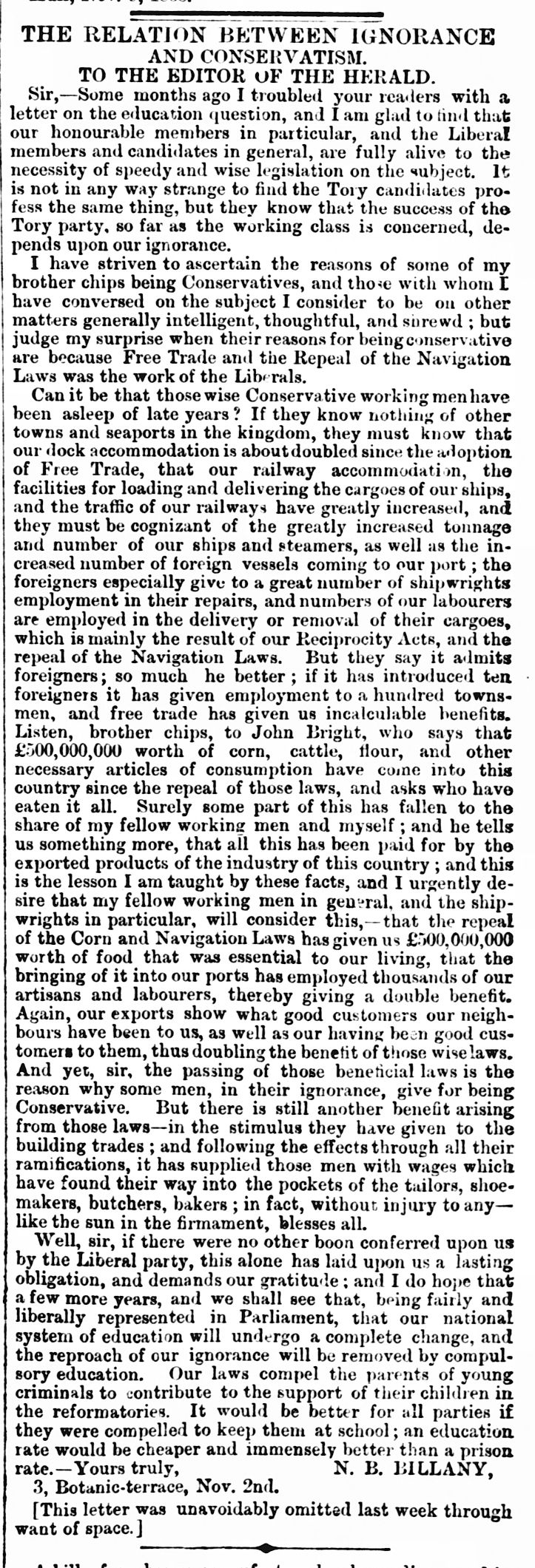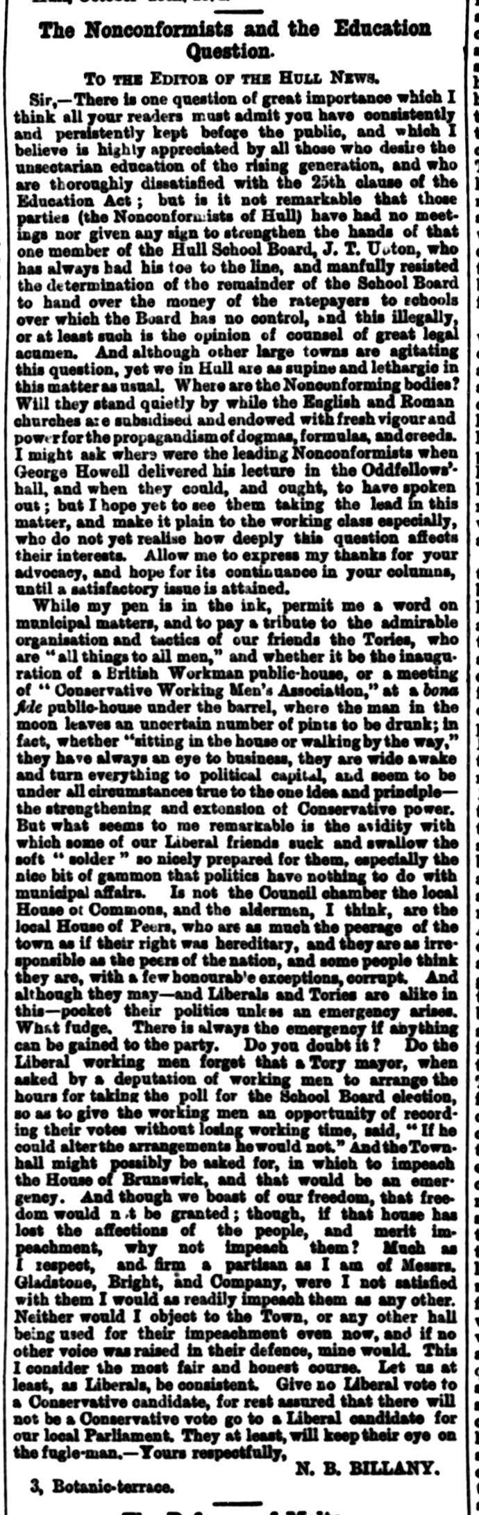 The Nonconformists and the Education Question, Letter to the Editor