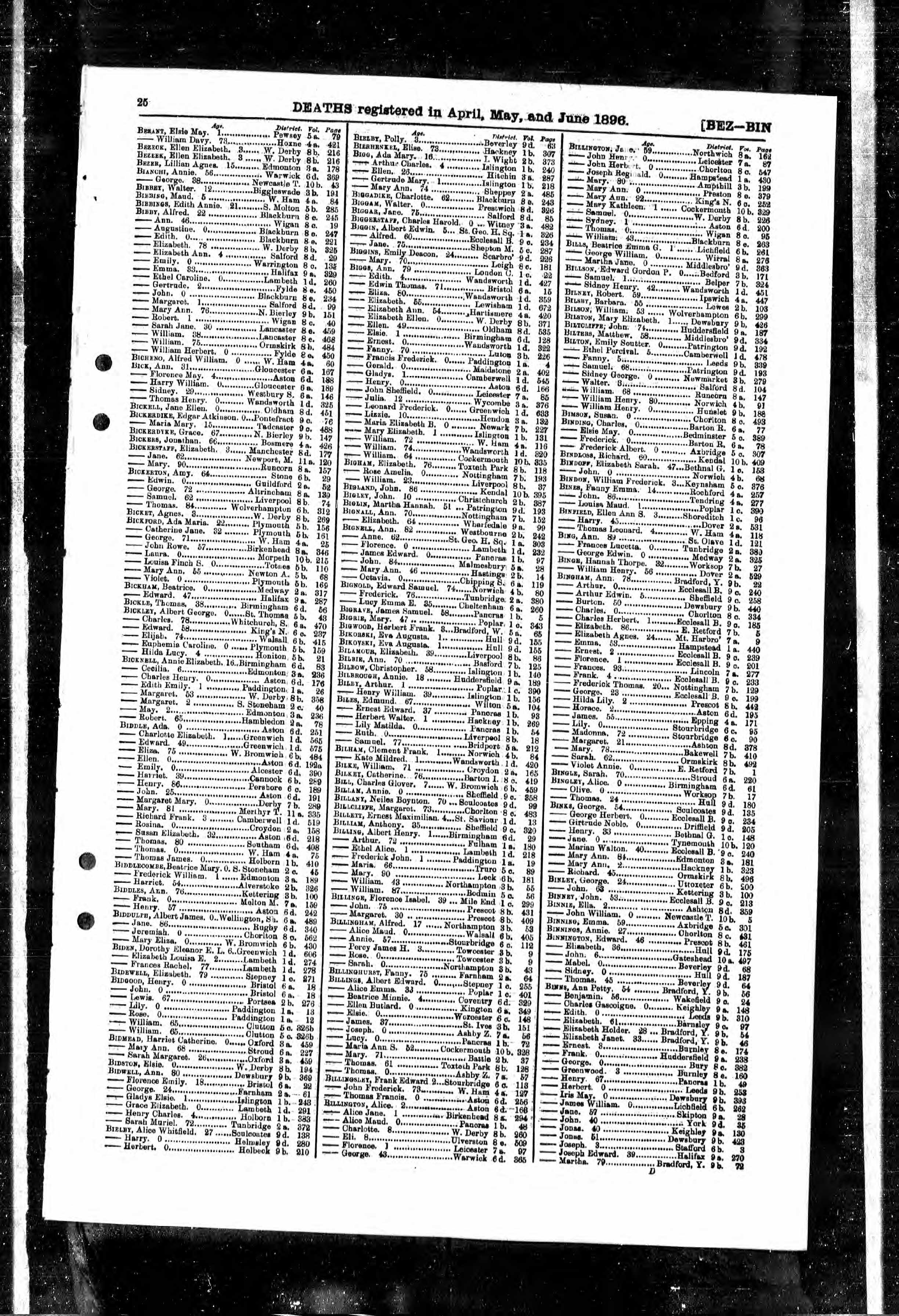 Death Registration Index 1896 Hull, Yorkshire, England