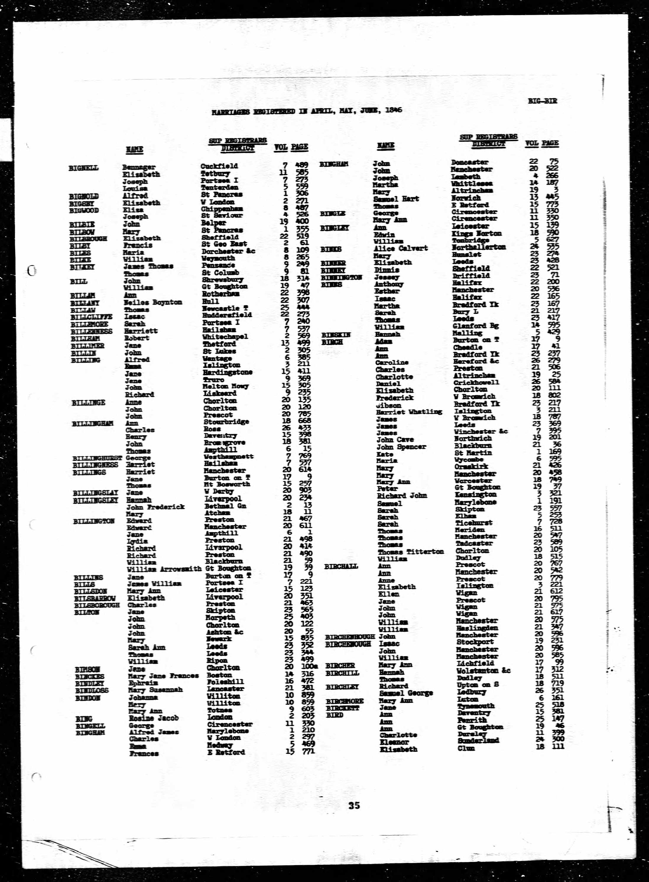 Marriage Registration Index 1846 Hull, Yorkshire, England